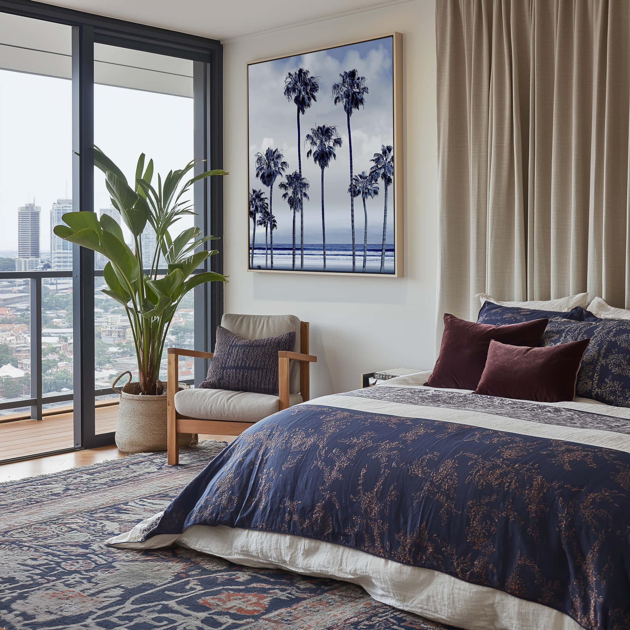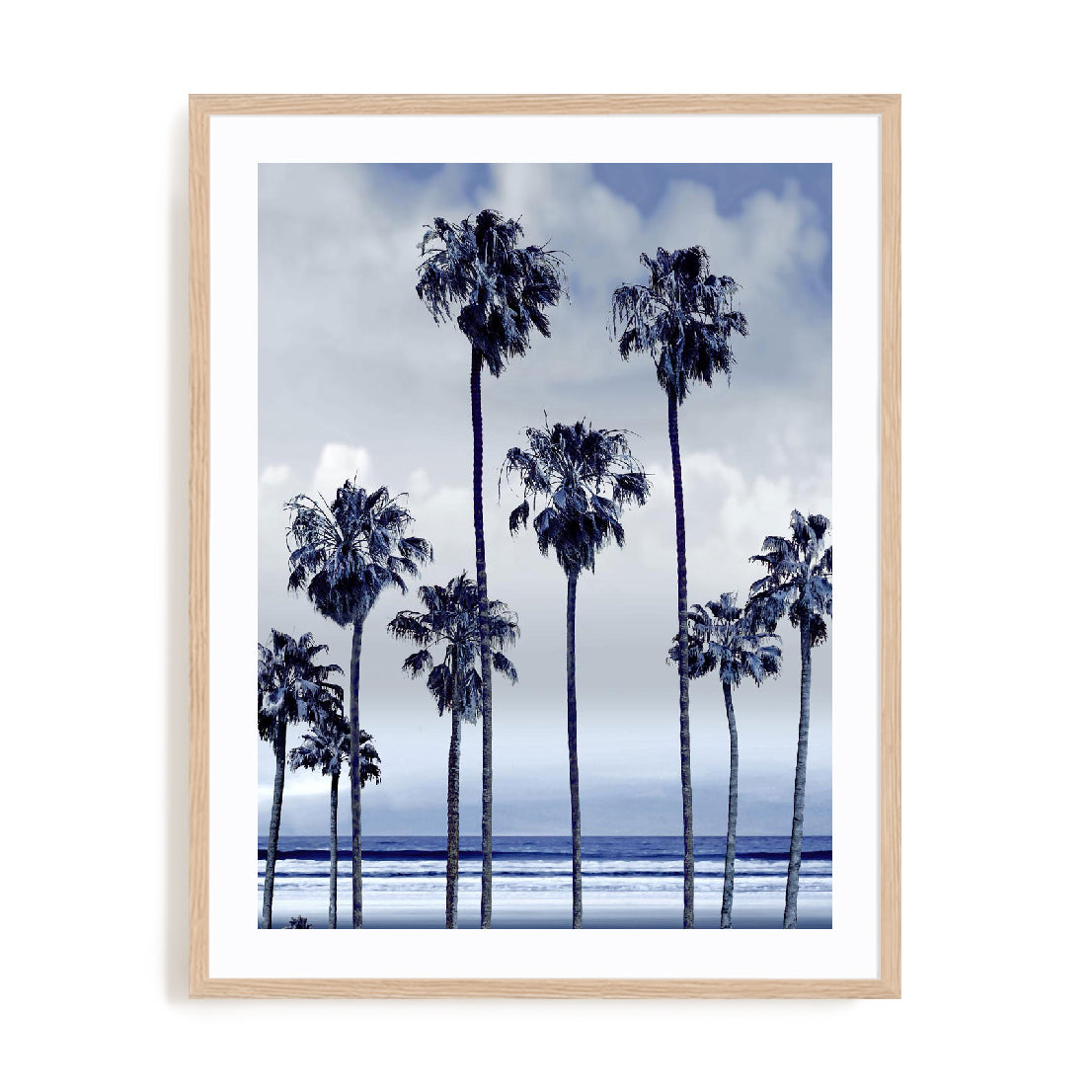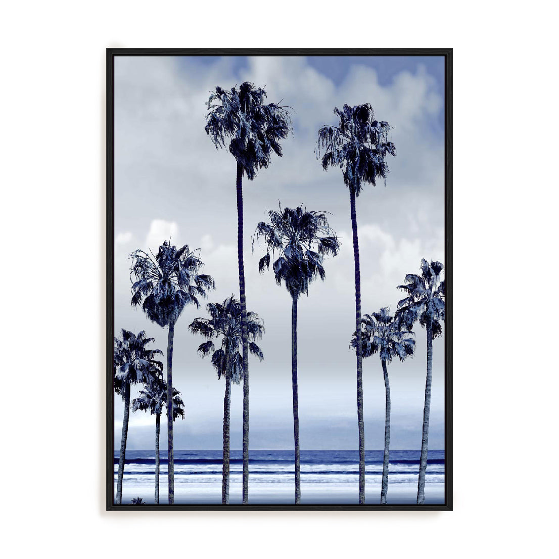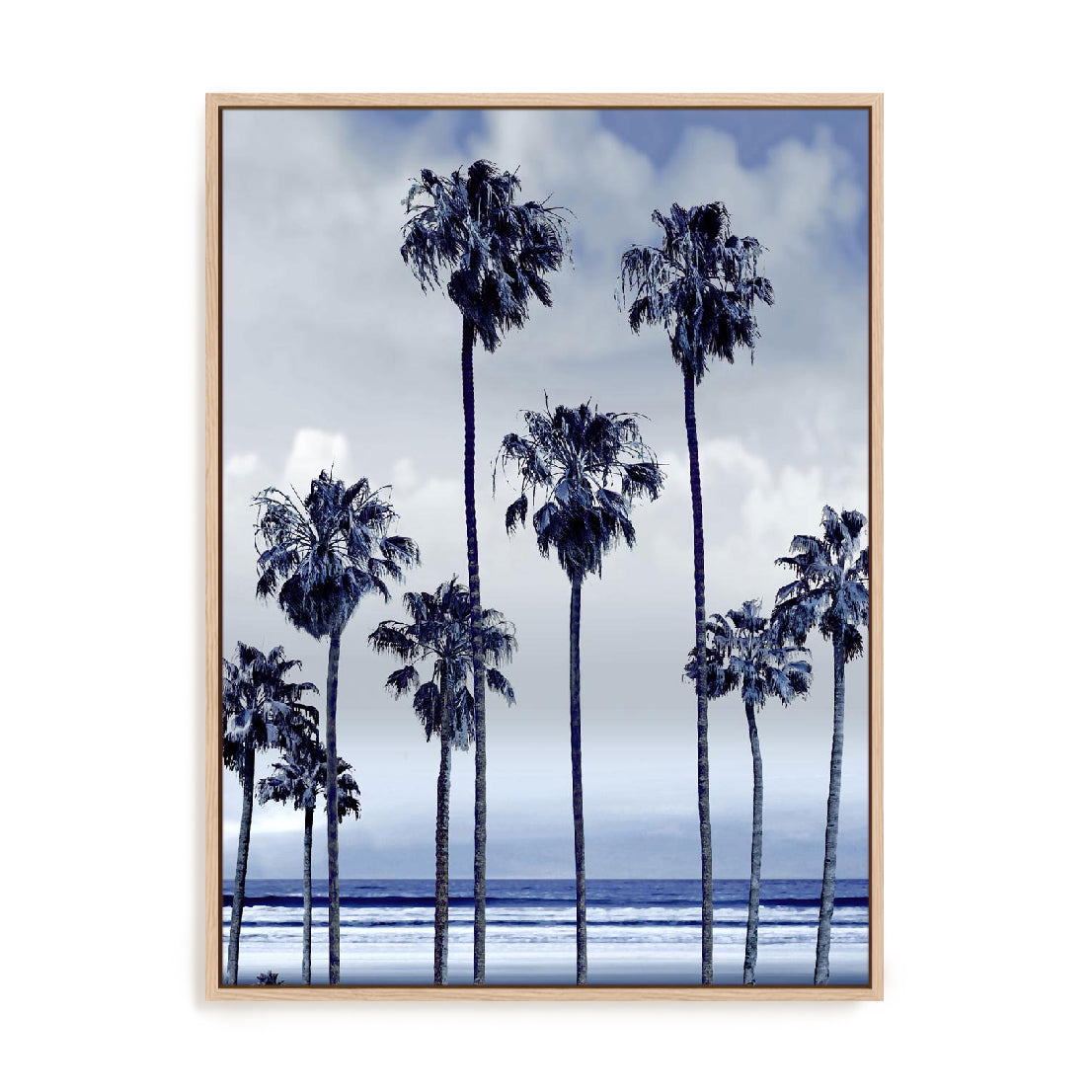 Set an atmospheric tone with Beach Palms Indigo II, where slender palms reach skyward under dramatic indigo-tinged clouds. The composition captures a seaside scene transformed by the weight of a gathering storm, blending stormy greys and muted blues with subtle sandy undertones. Ideal for living rooms or sophisticated study spaces, it brings a contemplative, artistic edge. Printed with superior giclée methods on either 300gsm premium canvas or archival art paper, and handcrafted with sustainable solid timber frames, this artwork offers both timeless appeal and enduring quality. Inspired by the quiet drama of changing coastal skies, it invites reflection and depth into your interiors. Anchor your space with this ready-to-hang masterpiece.