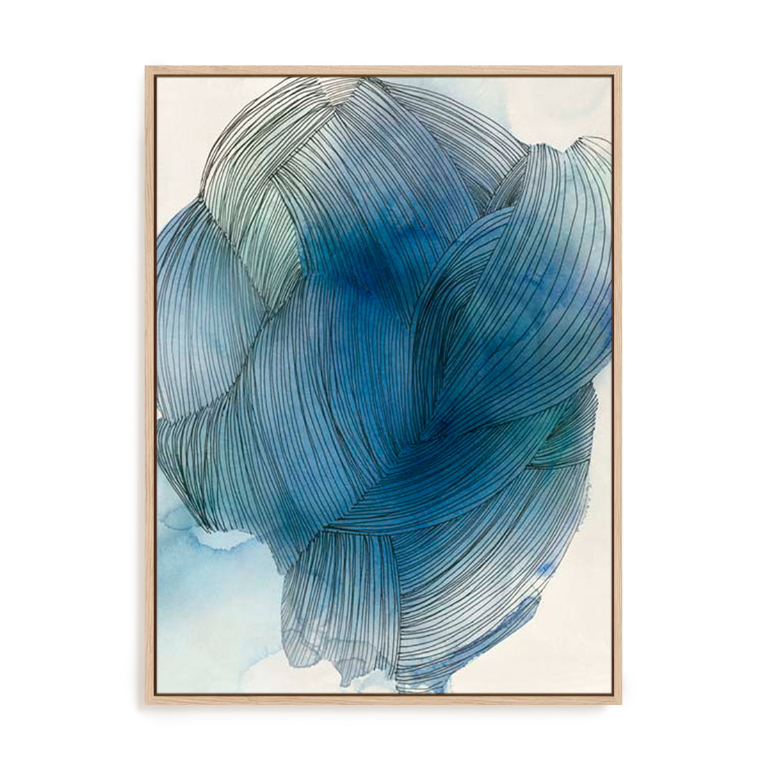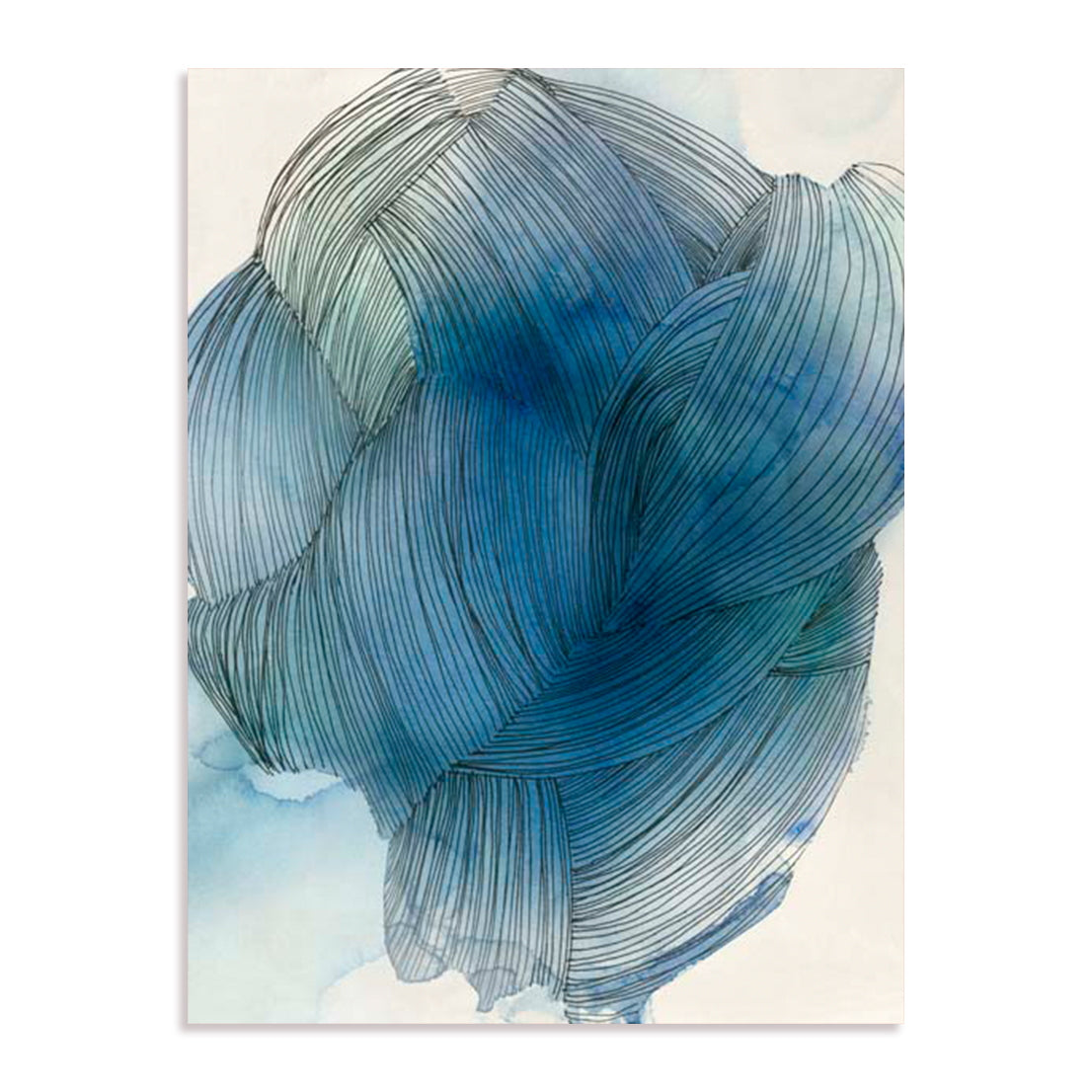 Blue Nexus I merges flowing linework with watercolour textures in shades of navy, ocean, and sky blue. The swirling motif draws the viewer inward, evoking movement, motion, and the passage of energy. The fine inked lines give structure to the freeform was
