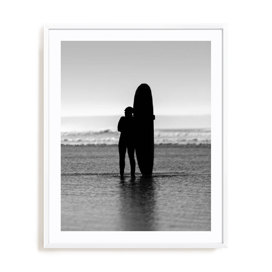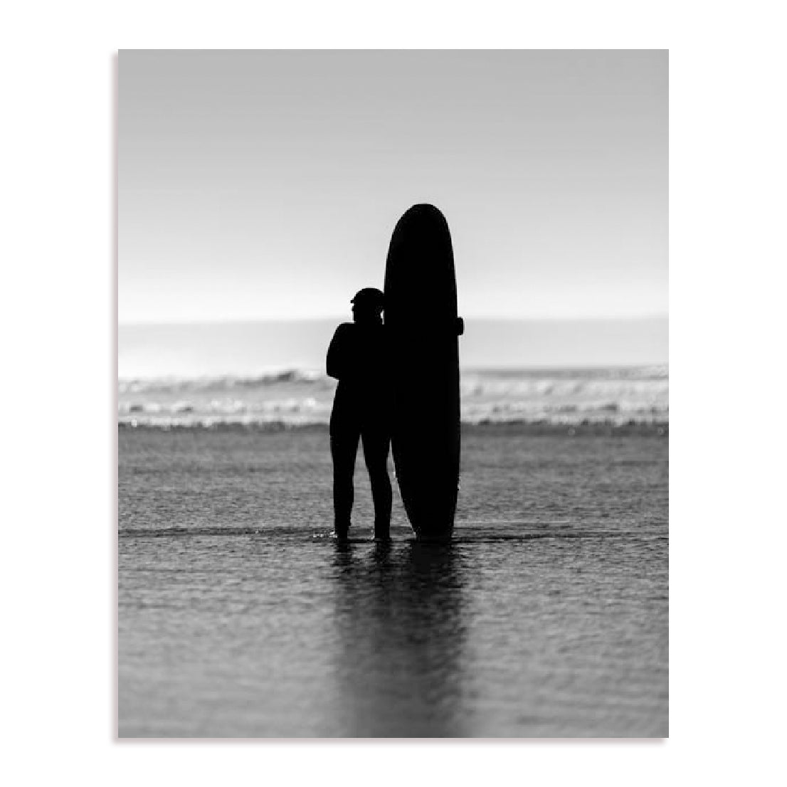 A moment of stillness captured at the edge of the day, inviting the room to slow down. A single figure stands in shallow water, the surfboard rising like a dark, protective shape against a pale horizon. The image is pared back to essentials: soft gradients in sky and sea, a gentle band of distant waves, and a grounded reflection that anchors the subject. This minimal composition creates emotional space, balancing solitude with calm assurance, and it reads as timeless rather than trendy. As coastal photography wall art, it suits Australian Coastal and modern interiors, pairing beautifully with warm neutrals, linen textures, and natural timber. Produced with premium giclée printing to preserve smooth tonal transitions, then finished with sustainable materials and a handcrafted frame, it sits comfortably within affordable licensed prints Australia while keeping a refined presence. Ideal for framed wall art Melbourne clients placing it in a bedroom for restoration or a living room for quiet focus. Made in Melbourne, ready-to-hang, with free delivery Australia-wide. Bring it into your bedroom or lounge and let the calm linger.