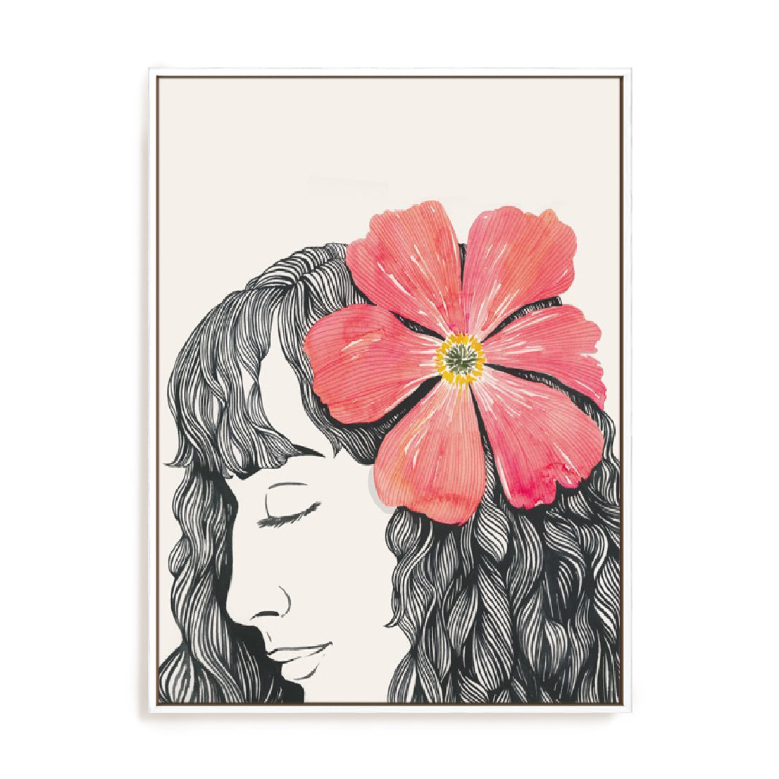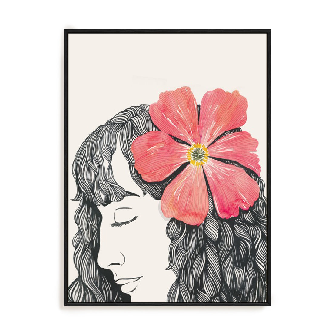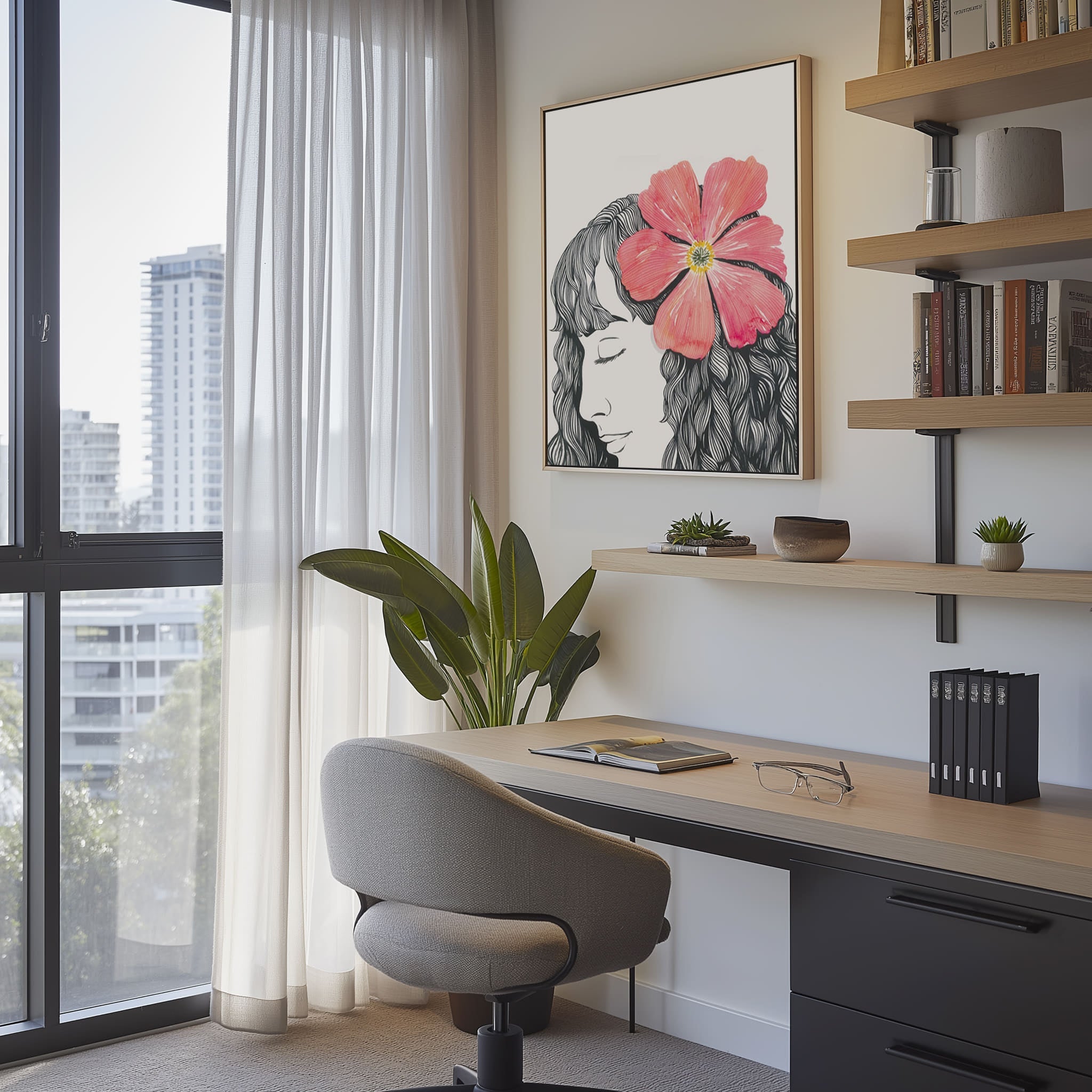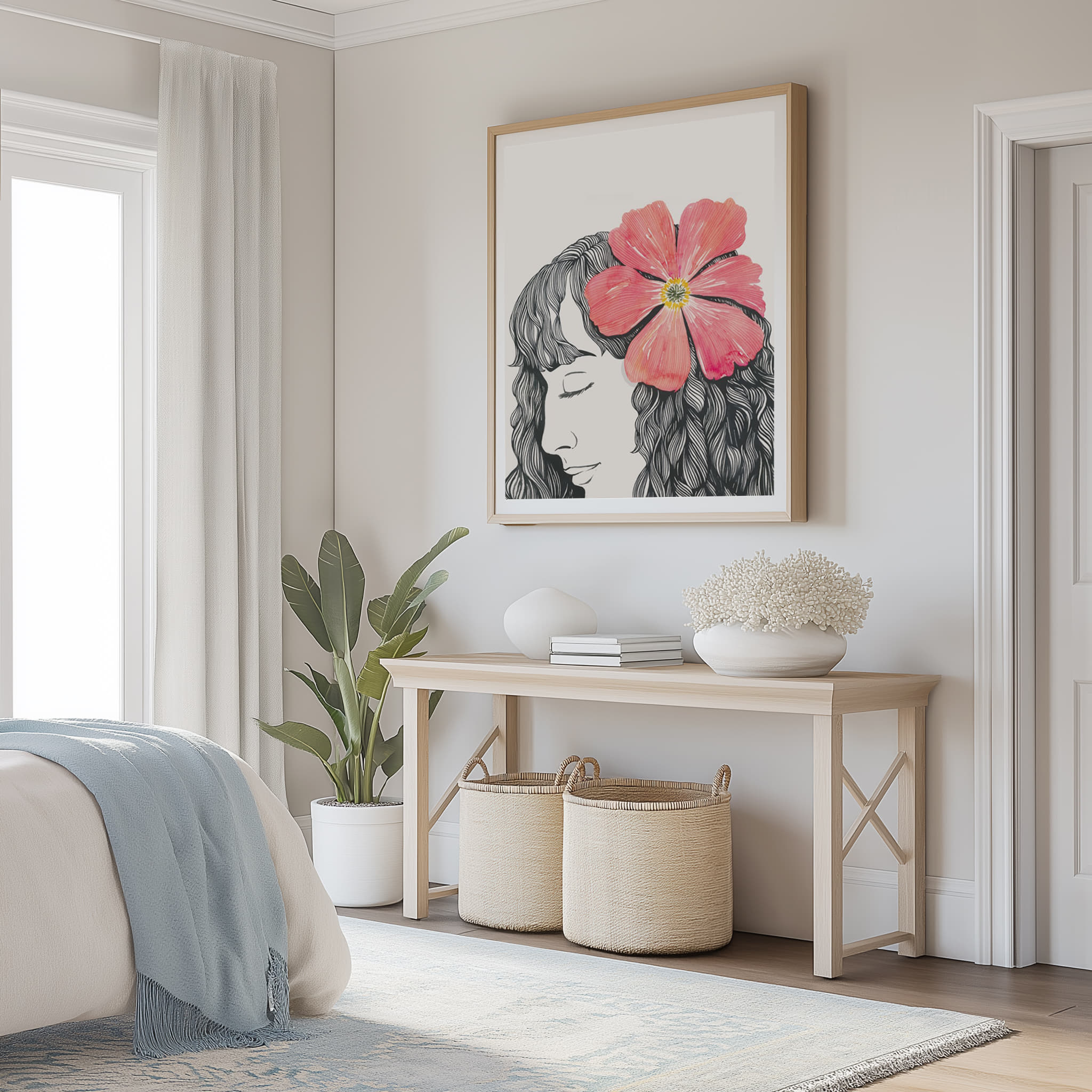 A harmonious blend of monochrome elegance and floral vibrance, Flower in Her Hair II captures the soft serenity of a closed-eye moment. The detailed black-and-white linework of the female portrait is contrasted with a vivid coral flower, evoking both delicacy and strength. Printed on high-quality canvas using long-lasting giclée ink, this framed fashion artwork is ready to hang and made to last. Ideal for adding quiet sophistication to a living room or entry space, its perfect for those seeking affordable framed prints with artistic flair. Embrace the poetry of this image and let it tell your story on the wall.