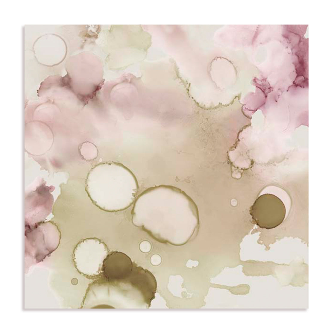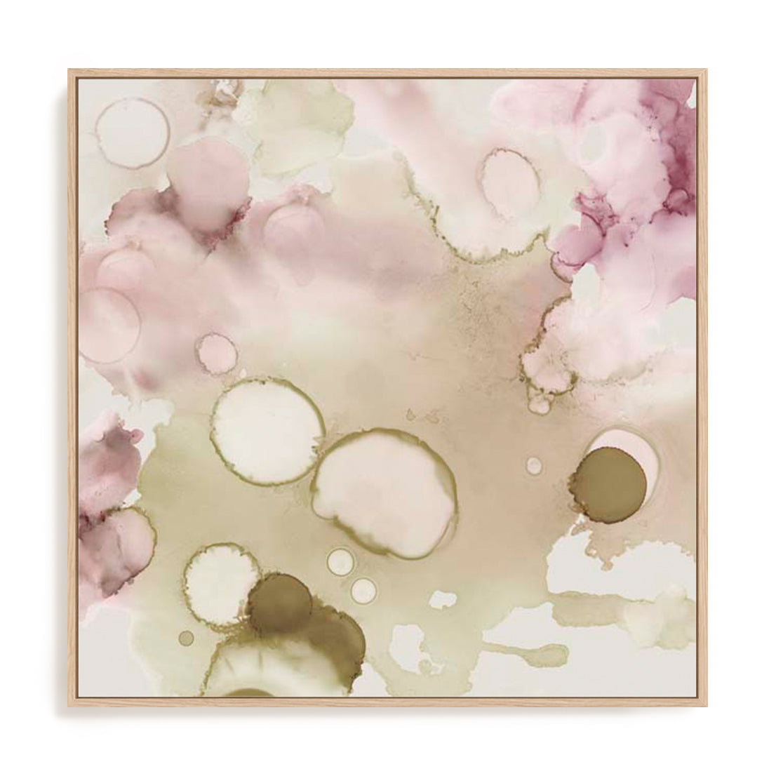 Feminine and floaty, In The Glow Of A Blush II continues the story of abstract botanicals through ink-like blooming rings in blush pinks, soft greens and warm neutrals. The dreamy palette and organic forms suggest movement and softness, like petals suspen
