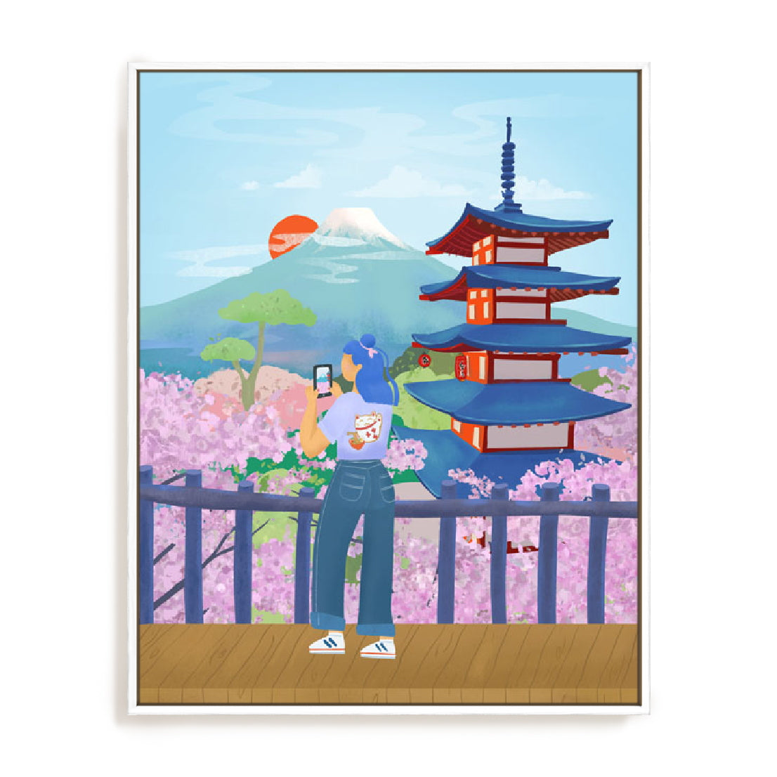 Japan captures a moment of pause, where observation becomes the central experience rather than action. The composition is anchored by a solitary figure positioned at the edge of the scene, directing attention outward toward layered architectural forms and a softly receding mountain horizon. Cherry blossoms introduce gentle movement, their rounded forms contrasting with the structured geometry of the pagoda. The palette is cool and restrained, dominated by blues and soft pinks that create visual depth without heaviness. The overall rhythm is calm and contemplative, evoking travel, memory, and quiet appreciation of place. Produced as an accessible licensed print in Australia, this artwork is printed using premium giclée techniques on archival materials to preserve colour integrity and detail. Each piece is finished with care and arrives ready-to-hang, reflecting Artey’s commitment to quality and thoughtful craftsmanship. Inspired by traditional Japanese landscapes and contemporary illustration, the artwork suits interiors that value calm structure and visual clarity. Ideal for a living room or office, it brings a sense of composure and cultural depth to everyday spaces. Bring this serene landscape into your home and create a place for reflection and visual escape.