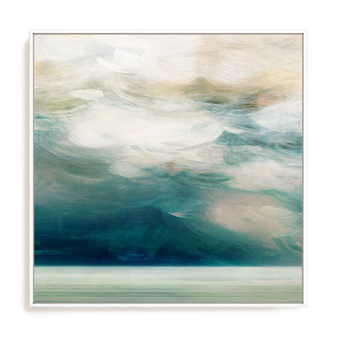Ocean Breeze II evokes the peaceful feeling of a day spent by the sea, capturing the soft movement of a cloudy sky and the deep, calming colours of the water. The intricate, textured brushwork in the sky blends tones of ivory and cream, suggesting gentle clouds, while the deep navy and dusty blue of the water provide a grounded, serene contrast. This modern abstract wall art brings a sense of tranquility and natural beauty to any space. Each piece is a premium giclée print, expertly framed with sustainable materials and handcrafted in Melbourne, offering accessible art in Australia that is ready to hang and enjoy. Let this calming seascape transform your space into a peaceful retreat.