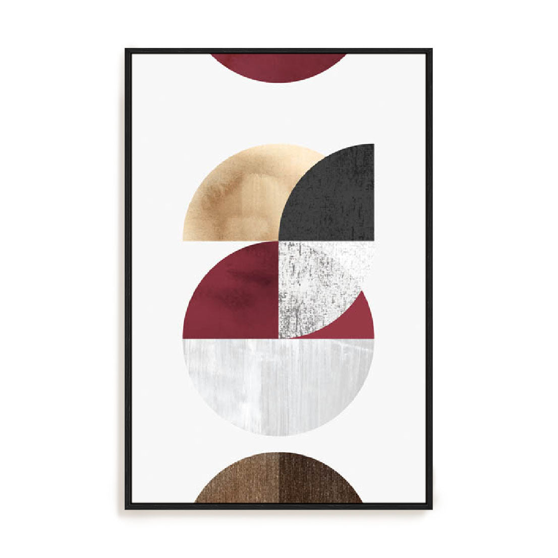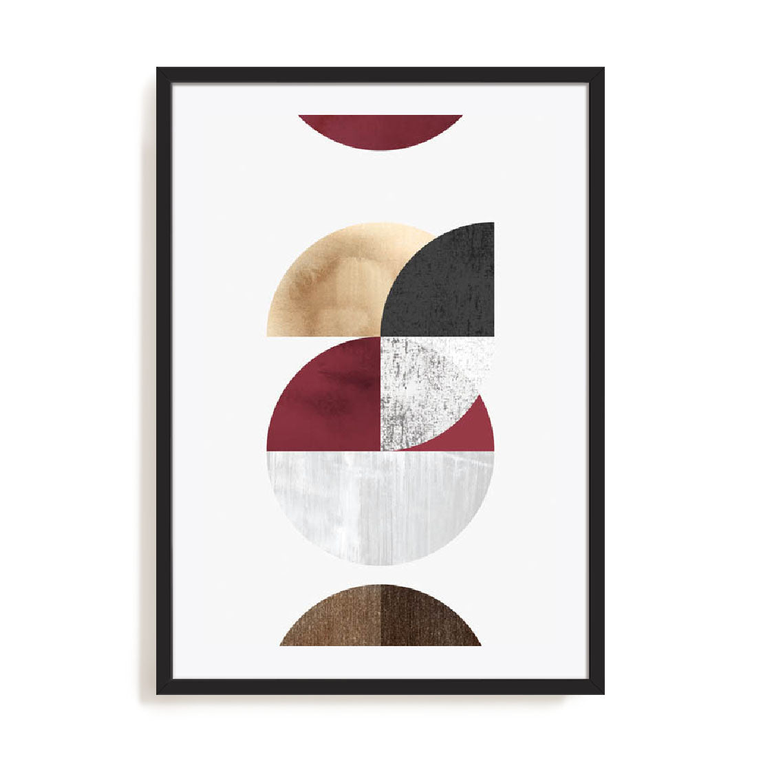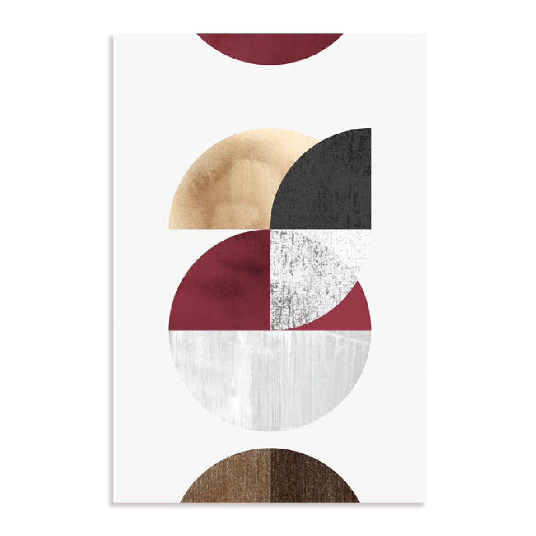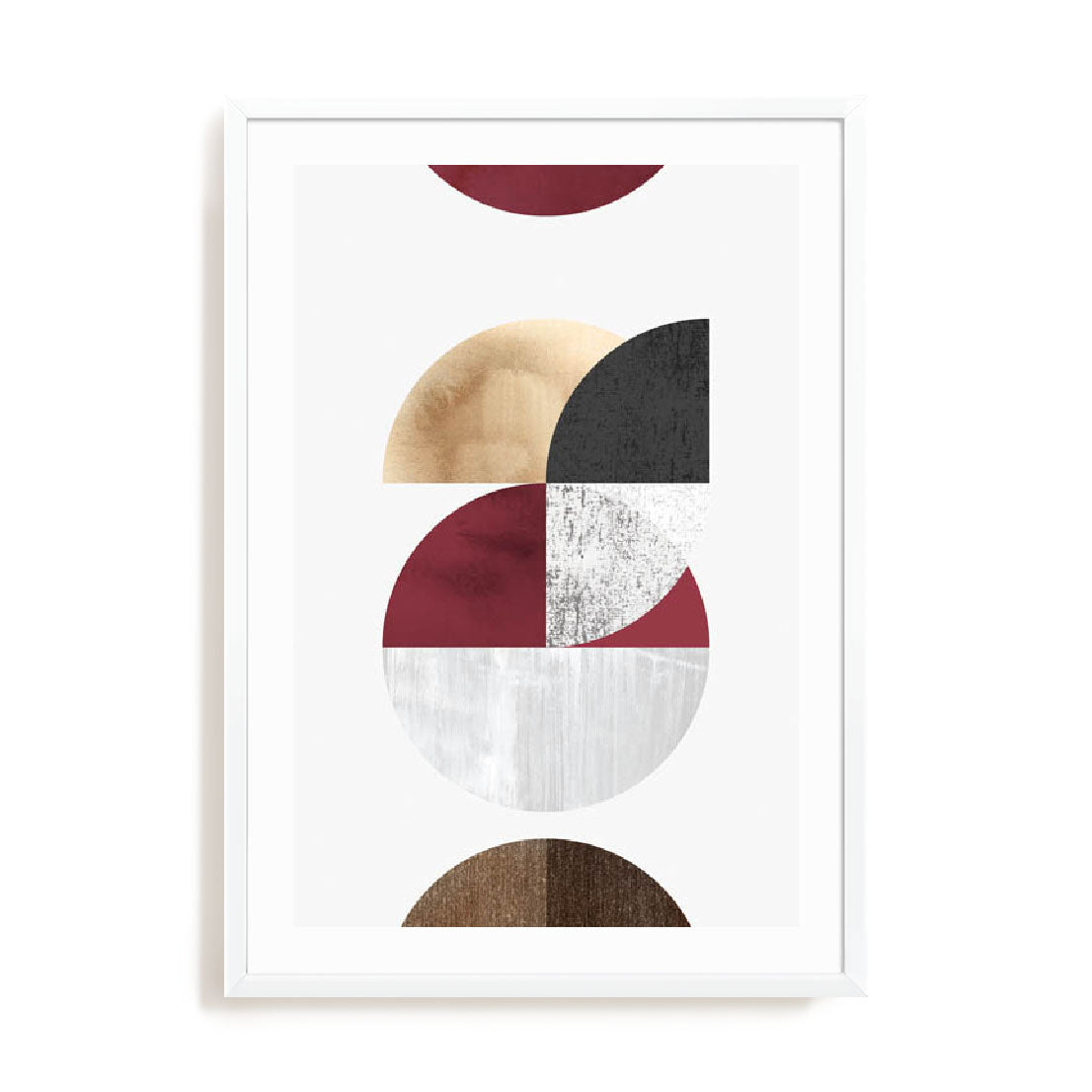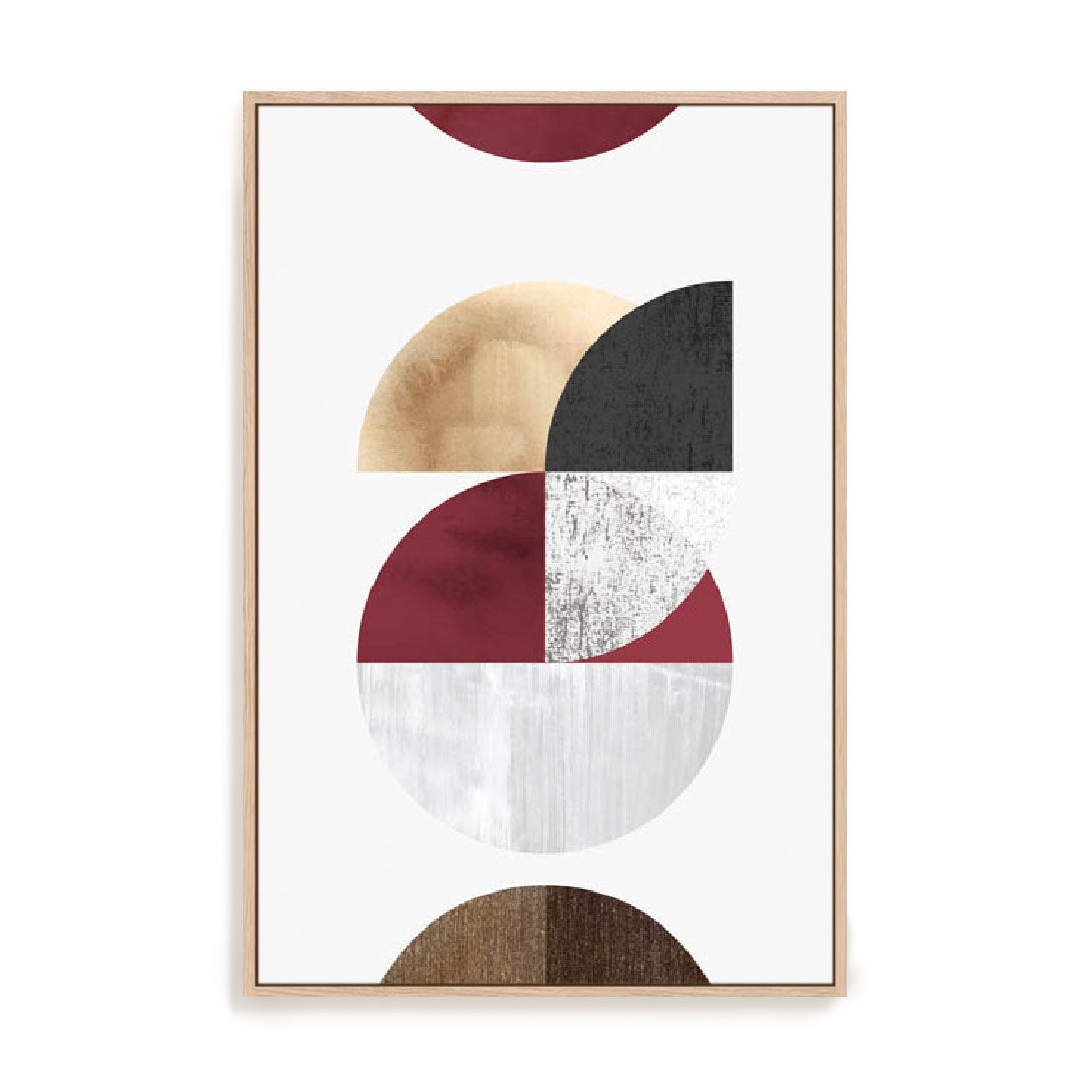 On the Brink III completes the series with a refined play of form and colour, layering circles in burgundy red, metallic gold, brushed silver, and ivory white. Its vertical composition adds height and rhythm to interiors, while the palette offers both boldness and subtlety. This artwork feels thoroughly contemporary, perfect for lovers of geometric design. Printed with giclée precision on archival-grade stock, it is finished with handcrafted FSC-certified timber frames in Melbourne. As a licensed piece, it balances affordability with enduring artistry, delivered free across Australia and ready to hang. Ideal for offices, living rooms, or hallways, On the Brink III adds sophistication and structure, grounding interiors with a modern aesthetic.