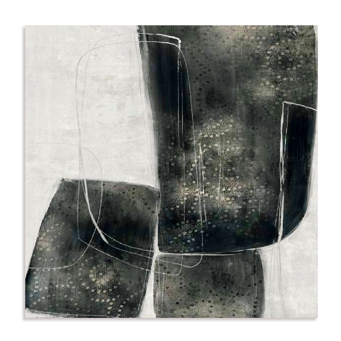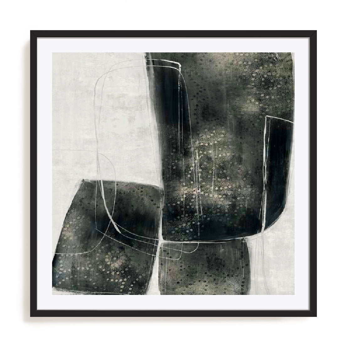 Shapes of Lacy I brings a refined and contemporary presence to your space, where strength and delicacy merge. The composition features bold, layered charcoal blocks softened by intricate dotted textures and fine white outlines that provide rhythm and balance. Its muted palette of greys, dusty blues, and deep charcoals gives the artwork a grounded elegance that blends seamlessly with modern interiors. The piece evokes sophistication and calm, perfect for creating a stylish focal point without overwhelming the room. Printed with premium giclée techniques on sustainable materials, each artwork is beautifully finished in a handcrafted frame, ensuring lasting quality. Licensed and made in Australia, it offers accessible art with a polished finish. Ideal for the living room, hallway, or office, this modern abstract wall art elevates everyday spaces with quiet sophistication and tactile charm.